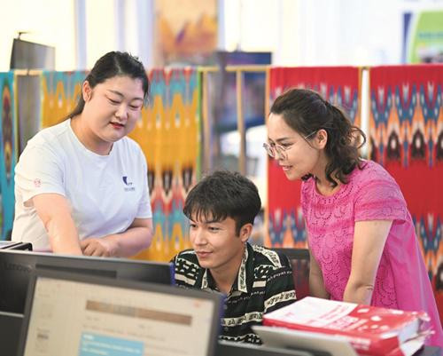 安徽环球文旅集团皮山分公司,工作人员在指导当地实习生(中)为安徽赴疆游客制订旅行计划。