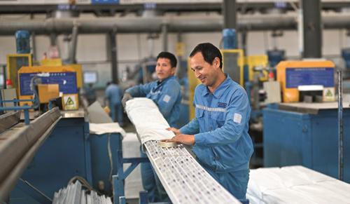 皮山县员工在安徽海螺2万吨型材生产线上进行加工操作。
